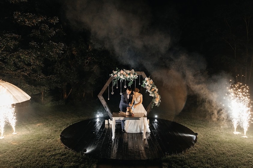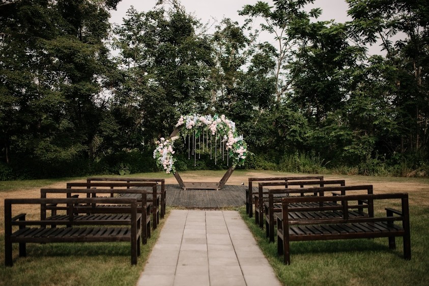 - Идеальные условия для выездной регистрации: солнечная поляна, терраса с видом на лес и естественные пейзажи